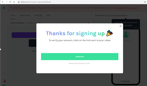 - Ya haz realizado el registro y Linktree te enviara al correo con el que te registraste, un mail para la confirmación, ve a tu correo y verifícalo