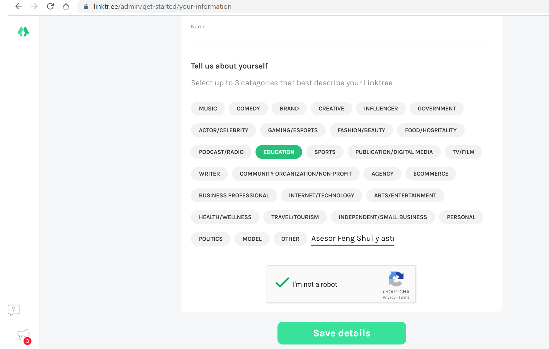 - Crea el nombre, ya puede ser tu mismo nombre si esta disponible para esta aplicación o otro que tu público te ubique fácilmente, regístrate en una categoría según las que tenemos disponibles en pantalla.
